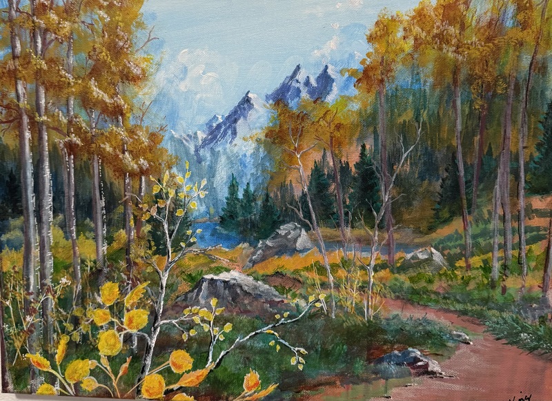 A serene, atmospheric autumn landscape with good depth and color harmony. The path takes you on a journey, to a lake at the base of some distant mountains.