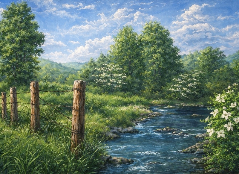 Dogwood in bloom along a small river in spring. Original acrylic on Canvas.